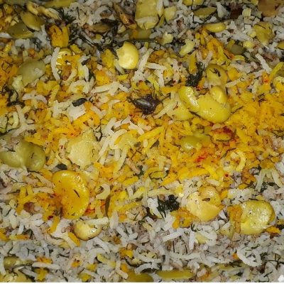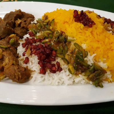 ۷- خلال بادام را از روی برنج بر می داریم، حدود دو سه کفگیر از قسمت سفید پلو جدا می کنیم. نصف برنج سفید را با زعفران مخلوط می کنیم و نصب بقیه را با کمی شیره آلبالو رنگین می کنیم.
