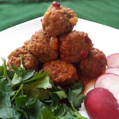 ۸- کوفته ها را درون ظرف مناسبی کشیده و سس آن را رویش می ریزیم و سرو می کنیم.